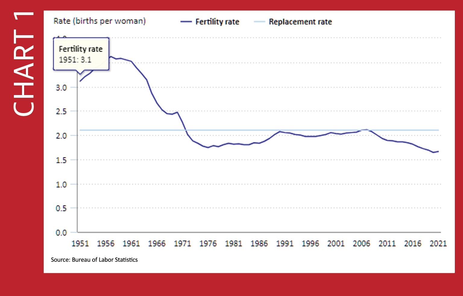 Population and labor force growth depend primarily on the fertility rate (number of children born to each woman). Yet not only are women having fewer children (1.94 children per woman, 1990-2021) than needed to sustain the population (i.e., 2.1 children per woman is the replacement rate), according to the BLS, (See Chart 1) but they also have them later in life.