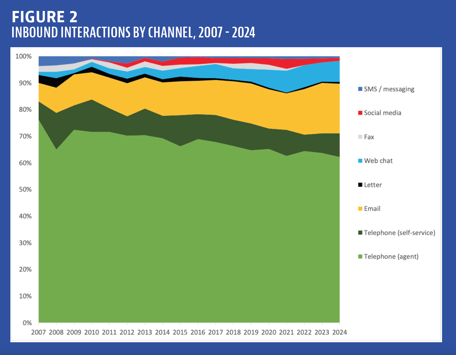 Live telephony accounts for 62% of inbound interactions at the end of 2024, with a further 9% coming through telephony self-service (of which the large proportion is touchtone IVR). (SEE FIGURE 2)
