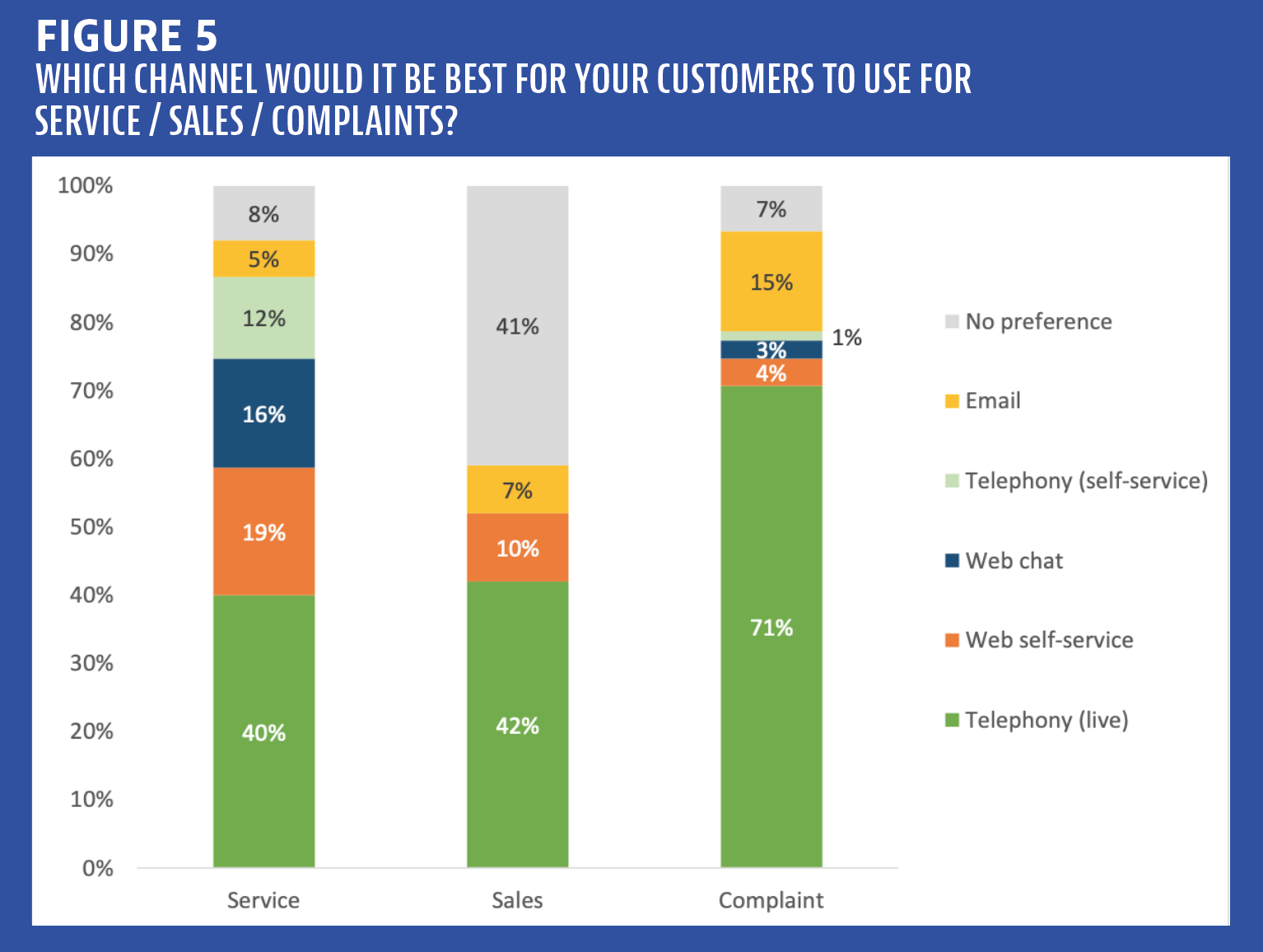 While a substantial minority of businesses recommend customers solve their own service issues online, and email is seen by 15% of respondents as the best way to make a complaint, this chart recognizes the ongoing dominance of the live voice channel. (SEE FIGURE 5)